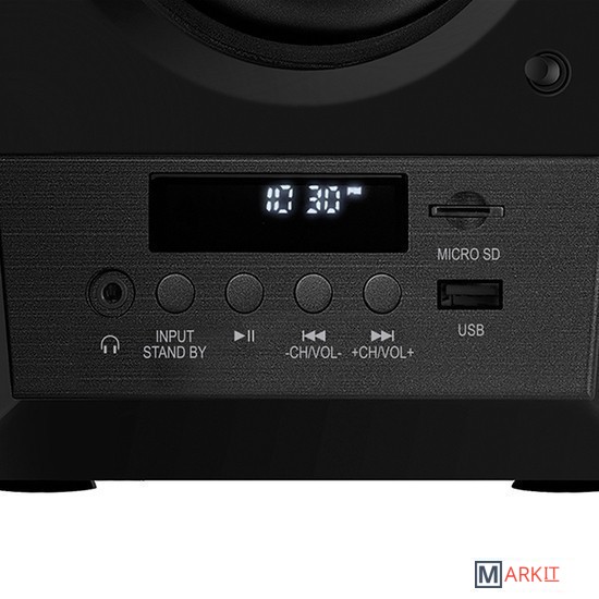 Акустика MC-20 с широким частотным диапазоном и двумя портами фазоинвертора обеспечивает 90 Вт звук. Колонки выполнены в классическом дизайне: передняя панель с черной матовой отделкой, кнопками управления и дисплеем. Система оснащена удобным пультом управления, встроенным радио, Bluetooth, слотом для SD-карт и разъемом для USB накопителей. К телевизору акустика подключается с помощью оптического входа.