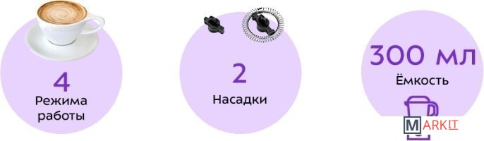 Режимы приготовления вспенивание холодного молока, вспенивание горячего молока, подогрев молока  (смешивание с подогревом и без)