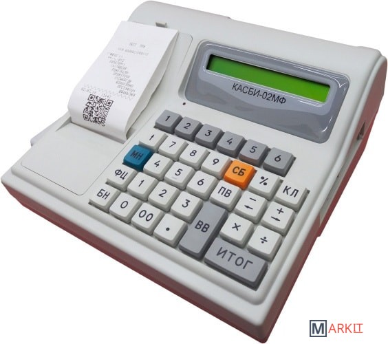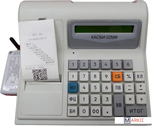 Контрольно–кассовая машина «КАСБИ-02МФ» предназначена для автоматизации учета, контроля и первичной обработки информации кассовых операций и регистрации ее на бумажной ленте. ККМ обеспечивает работу в фискальном режиме как без СКНО, так и с СКНО. При этом осуществляется блокировка при попытке перевода из режима работы с СКНО в режим работы без СКНО. Машина имеет режим реального времени. Машина может применятся в объектах торговли, сферы услуг (кроме транспортных, банков, связи, автозаправочных станций) и общественного питания без обслуживания потребителей официантами (барменами) за столиками.Общие сведения:Машина регистрирует проводимые через нее суммы, подсчитывает стоимость товара по стоимости его единицы и количеству, подсчитывает суммарную стоимость продаж и величину сдачи покупателю, в машине заложена возможность программирования величины налога на товары / услуги, записи в память необходимой текстовой информации, блока фиксированных цен на товары / услуги.Машина имеет встроенный блок энергонезависимой памяти (БЭП) с возможностью доступа к информации (считывания) только по паролю с сохранностью информации сроком не менее шести лет. Режим работы машины с БЭП называется фискальным.При вводе машины в эксплуатацию необходимо произвести регистрацию машины и перевод ее из нефискального (учебного) режима в фискальный.В фискальном режиме машина обеспечивает регистрацию в накопителе БЭП отчетных данных по Z - отчету (закрытию смены). При этом оформление любого печатаемого документа (чека, контрольной ленты и др.) сопровождается печатью признака наличия фискального режима (в конце любого печатаемого документа появляется надпись «Ф_РБ»(для режима работы с СКНО – QR-код), выполненная обратным курсивом).В учебном режиме признак фискального режима не отображается.