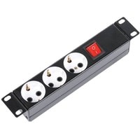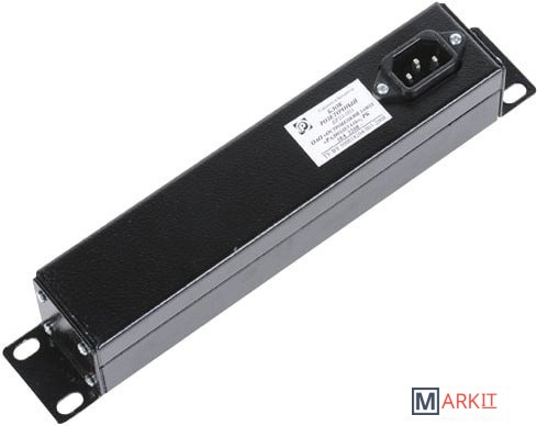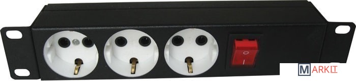 Блок имеет три розетки, выполнен в металлическом корпусе. Предназначен для размещения в 10” шкафах. Розетки расположены горизонтально, для удобного подсоединения коленчатых штекеров. На лицевой части блока установлен выключатель