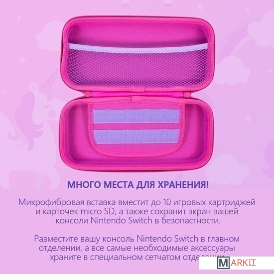 Отправьтесь со своей Nintendo Switch в приключение вместе со сказочным единорогом!Этот чехол защитит вашу консоль, где бы вы ни находились, ведь его идеальный размер позволяет взять вашу Nintendo Switch даже в путешествия налегке. Корпус чехла выполнен из прочного материала и поможет спасти ваше устройство при случайных падениях, мягкая внутренняя подкладка предотвратит появление случайных царапин, а в кармашках для картриджей ваши любимые игры будут в полной сохранности. На одной стороне чехла удобно хранить вашу консоль, а на другой стороне внутри сетчатого кармана можно разместить необходимые аксессуары. Разработан и создан Numskull Designs из высококачественных материалов.