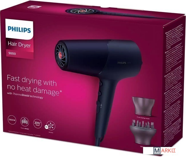 Технология ThermoShield для непревзойденной защиты волос от перегреваДатчик защиты от перегрева в активном режиме оптимизирует и управляет температурой воздуха, защищая ваши волосы от урона, вызванного перегревом. Оцените удобную и быструю сушку с технологией ThermoShield.Мощный мотор 2300 Вт создает воздушный поток скоростью до 110 км/чБлагодаря высокой мощности 2300 Вт этот фен генерирует воздушный поток скоростью до 110 км/ч, что позволяет сушить волосы быстро и достигать профессиональных результатов в укладке.Ионизация 4x для гладких, блестящих волосЭта мощная система ионизации излучает до 80 млн ионов за одну процедуру сушки, обеспечивая гладкость и шелковистость волос.