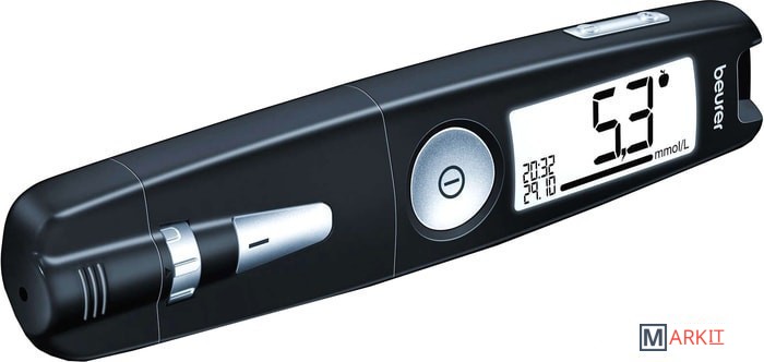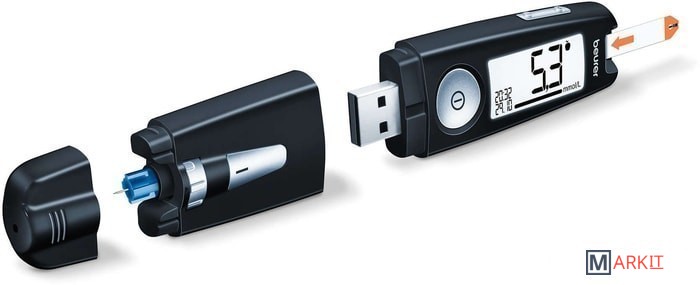 Уникальная конструкция 3-в-1:- измерительный модуль,- прокалывающее устройство,- модуль передачи данных (через USB в программное обеспечение на ПК).Особенности измерения:- 0,6 мкл - маленькая капля крови – нужен минимальный прокол,- 5 секунд - быстрое измерение,- GDH-FAD – фермент для максимальной точности,- маркировка измерения (до еды, после еды, общее),- предупреждение о кетонах.Особенности передачи данных:- используется программное обеспечение Beurer HealthManager,- возможность пересылать данные из ПО врачу,- бесплатные онлайн-консультации врача-терапевта 1 категории – проект «Доктор Beurer» (для владельцев медицинских диагностических приборов Вeurer c функцией передачи данных).Особенности расходных материалов:- 18 месяцев - срок хранения открытых тест-полосок,- тест-полоски в индивидуальной упаковке (50 штук) или во флаконах (25 шт.*2) на выбор,- стерильные ланцетные иглы G28 и G33 (универсальные – подходят для ланцетных устройств всех производителей),- стерильные ланцетные иглы G33 Soft Touch – деликатный прокол для чувствительной кожи.
