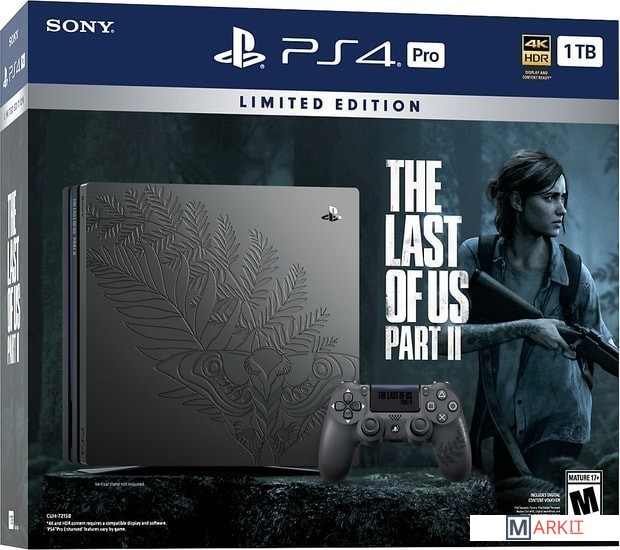 Специальное издание комплекта PS4 Pro с игрой "Одни из нас: Часть II". Этот комплект включает уникальную консоль PS4 Pro с матовым покрытием и выгравированной татуировкой Элли, беспроводной контроллер DualShock 4, физическую копию игры "Одни из нас: Часть II", а также цифровые материалы, включая динамическую тему для PS4, аватары и многое другое.Контроллер в матовом черном исполнении с белой маркировкой также украшен изображением татуировки Элли на правой рукоятке и логотипом игры на сенсорной панели.