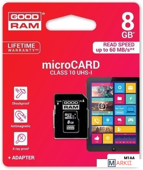 Markit » Карты памяти » Карта памяти GOODRAM microSDHC (Class 10) UHS-I 8GB + адаптер [M1AA-0080R11]