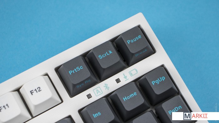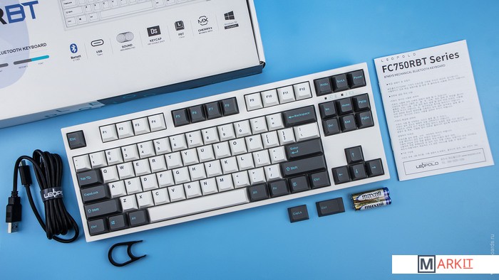 FC750R BT – беспроводная клавиатура 80% формата с низкопрофильными double-shot PBT кейкапами и заводской шумоизоляцией.USB Type-C спрятан в центре под корпусом, а на самой клавиатуре имеются центральная и две боковые канавки под кабель.Поддержка Bluetooth 5.1Мультидевайс режим поддерживает подключение до 4-х устройств. Работает от двух батареек типа ААА. Если пользоваться клавиатурой 6 часов в день, то одного комплекта батареек хватит на полгода.Разъём Type-CБолее универсальный и современный, по сравнению с традиционным mini-USB разъёмом.Обратите внимание, что клавиатура не будет работать с кабелем USB Type-C USB Type-C.Мультимедиа и дополнительные FN функцииКлавиатура поддерживает сочетание клавиш для регулировки громкости и управления музыкой.DIP-переключатели на задней панелиДают возможность поменять местами функции кнопок Ctrl и Caps Lock, Windows и Alt, Windows и Fn или отключить Windows.Клавиши толщиной 1,5 ммИзготовлены из PBT пластика с применением double-shot технологии – неубиваемые, приятные на ощупь и при нажатии издают мягкий глухой звук.Регулируемые ножкиПрочные регулируемые ножки позволят приподнять клавиатуру и изменить угол наклона для комфортной печати, а прорезиненный низ не даст клавиатуре сдвинуться с места.ШумоизоляцияВойлочная подложка внутри корпуса поглощает звуки при нажатии и делает процесс печати тише.Если тишина имеет большое значение, рекомендуем заменить ее на шумоизоляцию из бипласта и установить виброизоляцию.Низкопрофильные клавиши Step-Sculpture2Заметно ниже Cherry профиля и имеют оптимальный угол наклона для комфортной печати.Клавиатура совместима с Mac OSFN-слой работает на Mac OS, кроме клавиш F6, F8, F9. Поменять местами клавиши-модификаторы можно в системных настройках. Проверено с MAC OS 10.13Сменные клавишиВ комплекте есть 2 сменные клавиши для переназначенных клавиш Ctrl и Caps Lock.Функция 6-key Rollover (6KRO)Позволяет одновременно нажимать до 6 клавиш (6KRO), этого хватит для игр и печати.