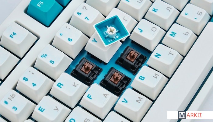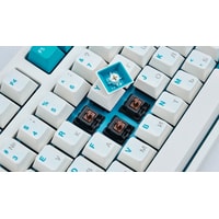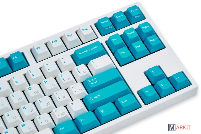 Тип: тактильныйСила нажатия: 55 грамм (средние)Длина пути: 4 мм (2 мм до срабатывания)Данная модель выполнена в белом цвете с мятно-голубыми клавишами-модификаторами — расцветка получилась очень свежей и приятной. Клавиатура собрана добротно и монолитно, а сочетание высококачественных double-shot PBT клавиш с переключателями Cherry MX и звукопоглощающей подложки позволяет сделать печать на клавиатуре максимально тихой (насколько это возможно для механики). Mini-USB порт спрятан в центре под корпусом, а на самой клавиатуре имеются центральная и две боковые канавки под кабель.Клавиатура поддерживает сочетание клавиш для регулировки громкости и управления музыкой, также имеется возможность переключения между 6KRO и NKRO.DIP-переключатели на задней панелиДают возможность поменять местами функции кнопок Ctrl и Caps Lock, Windows и Alt, Windows и Fn или отключить Windows.Звукопоглощающая подложкаПоглощает звуки при нажатии, делая процесс печати более тихим по сравнению с обычными механическими клавиатурами.Низкопрофильные клавиши Step-Sculpture2Данные клавиши заметно ниже и имеют оптимальный угол наклона, из-за чего, по отзывам, печатать приятнее и комфортнее, чем на более высоких клавишах.Клавиатура совместима с Mac OSFN-слой работает (кроме клавиш F6, F8, F9), а поменять местами клавиши-модификаторы можно в системных настройках. Проверено с MAC OS 10.13Функция Full N-key Rollover по USB (NKRO)Позволяет нажимать одновременно неограниченное количество клавиш. Для печати идеально подойдет как 6KRO, так и NKRO, независимо от вашей скорости. Для игр NKRO будет плюсом и неважно, нажимаете ли вы больше 6 кнопок или нет, поскольку, играя в любую игру, вы можете случайно нажать пару лишних клавиш и из-за этого клавиатура имеет шанс не среагировать на нажатие, которое вы хотели совершить изначально. Имеется возможность переключения между NKRO и 6KRO через FN сочетания.