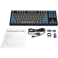 КЛАВИАТУРА БЕЗ КИРИЛЛИЦЫТип: линейныйСила нажатия: 60 грамм (тяжелые)Длина пути: 4 мм (2 мм до срабатывания)Данная модель выполнена в сочетании пурпурно-фиолетового, серого и чёрного цветов, расцветка обязательно понравится любителям сочных, но приглушённых красок. Клавиатура собрана добротно и монолитно, а сочетание высококачественных double-shot PBT клавиш с переключателями Cherry MX и звукопоглощающей подложкой позволяет сделать печать на клавиатуре максимально тихой (насколько это возможно для механики). Mini-USB порт спрятан в центре под корпусом, а на самой клавиатуре имеются центральная и две боковые канавки под кабель.Клавиатура поддерживает сочетание клавиш для регулировки громкости и управления музыкой, также имеется возможность переключения между 6KRO и NKRO.DIP-переключатели на задней панелиДают возможность поменять местами функции кнопок Ctrl и Caps Lock, Windows и Alt, Windows и Fn или отключить Windows.Звукопоглощающая подложкаПоглощает звуки при нажатии, делая процесс печати более тихим по сравнению с обычными механическими клавиатурами.Низкопрофильные клавиши Step-Sculpture2Данные клавиши заметно ниже и имеют оптимальный угол наклона, из-за чего, по отзывам, печатать приятнее и комфортнее, чем на более высоких клавишах.Клавиатура совместима с Mac OSFN-слой работает (кроме клавиш F6, F8, F9), а поменять местами клавиши-модификаторы можно в системных настройках. Проверено с MAC OS 10.13Функция Full N-key Rollover по USB (NKRO)Позволяет нажимать одновременно неограниченное количество клавиш. Для печати идеально подойдет как 6KRO, так и NKRO, независимо от вашей скорости. Для игр NKRO будет плюсом и неважно, нажимаете ли вы больше 6 кнопок или нет, поскольку, играя в любую игру, вы можете случайно нажать пару лишних клавиш и из-за этого клавиатура имеет шанс не среагировать на нажатие, которое вы хотели совершить изначально. Имеется возможность переключения между NKRO и 6KRO через FN сочетания.