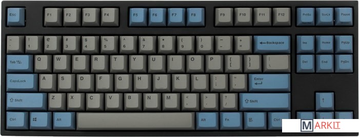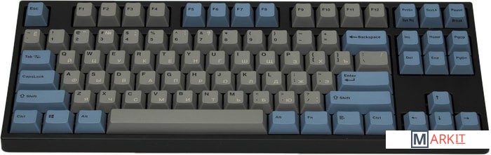 КЛАВИАТУРА БЕЗ КИРИЛЛИЦЫТип: кликающийСила нажатия: 60 грамм (несмотря на вес, средние)Длина пути: 4 мм (2.2 мм до срабатывания)Данная модель выполнена в сочетании пурпурно-фиолетового, серого и чёрного цветов, расцветка обязательно понравится любителям сочных, но приглушённых красок. Клавиатура собрана добротно и монолитно, а сочетание высококачественных double-shot PBT клавиш с переключателями Cherry MX и звукопоглощающей подложкой позволяет сделать печать на клавиатуре максимально тихой (насколько это возможно для механики). Mini-USB порт спрятан в центре под корпусом, а на самой клавиатуре имеются центральная и две боковые канавки под кабель.Клавиатура поддерживает сочетание клавиш для регулировки громкости и управления музыкой, также имеется возможность переключения между 6KRO и NKRO.DIP-переключатели на задней панелиДают возможность поменять местами функции кнопок Ctrl и Caps Lock, Windows и Alt, Windows и Fn или отключить Windows.Звукопоглощающая подложкаПоглощает звуки при нажатии, делая процесс печати более тихим по сравнению с обычными механическими клавиатурами.Низкопрофильные клавиши Step-Sculpture2Данные клавиши заметно ниже и имеют оптимальный угол наклона, из-за чего, по отзывам, печатать приятнее и комфортнее, чем на более высоких клавишах.Клавиатура совместима с Mac OSFN-слой работает (кроме клавиш F6, F8, F9), а поменять местами клавиши-модификаторы можно в системных настройках. Проверено с MAC OS 10.13Функция Full N-key Rollover по USB (NKRO)Позволяет нажимать одновременно неограниченное количество клавиш. Для печати идеально подойдет как 6KRO, так и NKRO, независимо от вашей скорости. Для игр NKRO будет плюсом и неважно, нажимаете ли вы больше 6 кнопок или нет, поскольку, играя в любую игру, вы можете случайно нажать пару лишних клавиш и из-за этого клавиатура имеет шанс не среагировать на нажатие, которое вы хотели совершить изначально. Имеется возможность переключения между NKRO и 6KRO через FN сочетания.