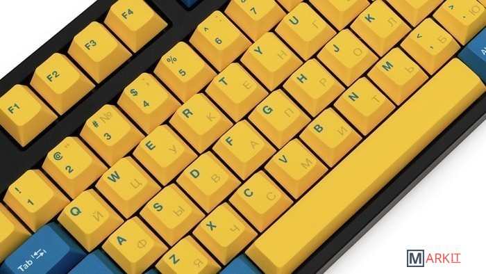 КЛАВИАТУРА БЕЗ КИРИЛЛИЦЫТип: тактильныйСила нажатия: 65 грамм (тяжелые)Длина пути: 4 мм (2 мм до срабатывания)Данная модель выполнена в сочетании пурпурно-фиолетового, серого и чёрного цветов, расцветка обязательно понравится любителям сочных, но приглушённых красок. Клавиатура собрана добротно и монолитно, а сочетание высококачественных double-shot PBT клавиш с переключателями Cherry MX и звукопоглощающей подложкой позволяет сделать печать на клавиатуре максимально тихой (насколько это возможно для механики). Mini-USB порт спрятан в центре под корпусом, а на самой клавиатуре имеются центральная и две боковые канавки под кабель.Клавиатура поддерживает сочетание клавиш для регулировки громкости и управления музыкой, также имеется возможность переключения между 6KRO и NKRO.DIP-переключатели на задней панелиДают возможность поменять местами функции кнопок Ctrl и Caps Lock, Windows и Alt, Windows и Fn или отключить Windows.Звукопоглощающая подложкаПоглощает звуки при нажатии, делая процесс печати более тихим по сравнению с обычными механическими клавиатурами.Низкопрофильные клавиши Step-Sculpture2Данные клавиши заметно ниже и имеют оптимальный угол наклона, из-за чего, по отзывам, печатать приятнее и комфортнее, чем на более высоких клавишах.Клавиатура совместима с Mac OSFN-слой работает (кроме клавиш F6, F8, F9), а поменять местами клавиши-модификаторы можно в системных настройках. Проверено с MAC OS 10.13Функция Full N-key Rollover по USB (NKRO)Позволяет нажимать одновременно неограниченное количество клавиш. Для печати идеально подойдет как 6KRO, так и NKRO, независимо от вашей скорости. Для игр NKRO будет плюсом и неважно, нажимаете ли вы больше 6 кнопок или нет, поскольку, играя в любую игру, вы можете случайно нажать пару лишних клавиш и из-за этого клавиатура имеет шанс не среагировать на нажатие, которое вы хотели совершить изначально. Имеется возможность переключения между NKRO и 6KRO через FN сочетания.