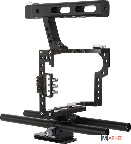 Клетка Viltrox VX-11 отличается от аналогов своей универсальностью, что позволяет использовать её с большим количеством камер типа Sony A7, A6, Panasonic GH4/5 и прочими, со схожими габаритами.Матричный вид позволяет закреплять дополнительное оборудование по периметру в любую из множества сот с резьбой 1/4 или 3/8 дюйма, а так же на холодный башмак, расположенный на рукоятке. Фиксатор проводов позволит надежно зафиксировать соответствующий кабель на входе в камеру, предотвратив нежелательный дисконект или повреждение портов камеры.Также в комплекте прилагаются направляющие длиной 300 мм и универсальное базовое крепление к ним. Все элементы изготовлены из авиационного алюминия, прочного и надежного, но легкого, что весьма важно при продолжительной работе с большим количеством оборудования.