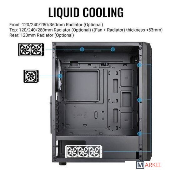 Поддерживаемые СЖО Передняя панель: 120/240/280/360 мм радиатор (Опционально)Верхняя панель: 120/240/280 мм радиатор(Опционально) ((вентилятор + толщина радиатора)