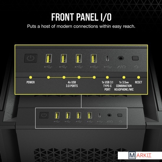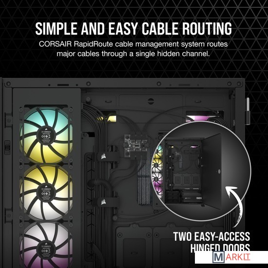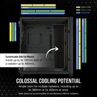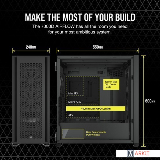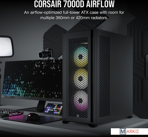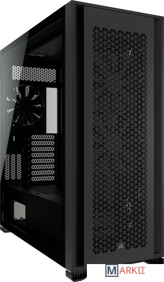 CORSAIR 7000D AIRFLOW — это корпус формата Full-Tower ATX для создания наиболее амбициозных сборок, обладающий невероятным потенциалом охлаждения благодаря оптимизированной для нагнетания воздушного потока стальной передней панели и оснащенный системой скрытой прокладки кабелей и тремя входящими в комплект вентиляторами CORSAIR AirGuide.Вместительное внутреннее пространство, мощный воздушный поток и продуманный дизайн корпуса 7000D AIRFLOW открывают целый мир возможностей для создания авторской неповторимой сборки.Повторитель ШИМ-сигнала вентилятора управляет вентиляторами, входящими в комплект поставки (всего их можно подключить до шести штук). Уменьшайте скорость вращения вентилятора, когда вам необходима бесшумная работа системы, или увеличивайте ее для работы в высокопроизводительном режиме — и все это с помощью одного 4-контактного ШИМ-разъема на материнской плате.Две стальные панели, обдуваемые мощным воздушным потоком, и прочная боковая панель из закаленного стекла толщиной 4 мм обеспечивают превосходное охлаждение и хороший обзор системы.Акцентируйте внимание на своей графической карте с помощью инновационного вертикального крепления для графических карт, которое отличается оптимальным размером для установки самых мощных современных графических карт и обеспечивает достаточное пространство для беспрепятственного воздухообмена.Оснащенный окошком кожух блока питания с возможностью персонализации позволяет увидеть все компоненты системы изнутри. Снимите панель, добавьте виниловую графику, нанесите свой логотип лазером или установите подсветку, чтобы придать вашей системе индивидуальности.Быстро и легко уложите основные кабели в один просторный потайной канал глубиной 25 мм за материнской платой, предусмотренный для всех кабелей, которые легко скрыть за откидной стальной дверцей.