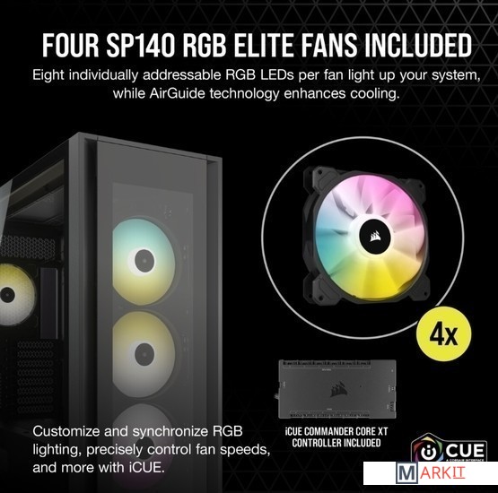 За тремя изготовленными из закаленного стекла панелями корпуса CORSAIR iCUE 7000X RGB формата Full-Tower ATX все компоненты вашей системы будут видны как на ладони: пространство для одновременной установки до трех 360-миллиметровых радиаторов, система скрытой прокладки кабелей и четыре входящих в комплект вентилятора CORSAIR SP140 RGB ELITE.Программное обеспечение CORSAIR iCUE объединяет все настройки, превращая вашу игровую станцию в цельную экосистему с эффектом полного погружения и интуитивно понятным управлением.Корпус iCUE 7000X RGB в сочетании с программным обеспечением CORSAIR iCUE является лучшим в своем классе интеллектуальным корпусом. Программное обеспечение iCUE позволяет легко настраивать RGB-подсветку и управлять скоростью вращения до шести вентиляторов.COMMANDER CORE XT — это больше, чем просто контроллер для управления подсветкой и скоростью вращения до шести вентиляторов. Его функционал можно расширить для мониторинга температуры (два температурных датчика входят в комплект поставки). Кроме того, контроллер COMMANDER CORE XT можно подключить к другим совместимым с iCUE устройствам, таким как полосы подсветки LS100 или комплекты расширения светодиодной RGB-подсветки Lighting PRO.Три прочные панели из закаленного стекла толщиной 4 мм обеспечивают обзор всех компонентов вашей системы.Акцентируйте внимание на своей графической карте с помощью инновационного вертикального крепления для графических карт, которое отличается оптимальным размером для установки самых мощных современных графических карт и обеспечивает достаточное пространство для беспрепятственного воздухообмена.Оснащенный окошком кожух блока питания с возможностью персонализации позволяет увидеть все компоненты системы изнутри. Снимите панель, добавьте виниловую графику, нанесите свой логотип лазером или установите подсветку, чтобы придать вашей системе индивидуальности.Быстро и легко уложите основные кабели в один просторный потайной канал глубиной 25 мм за материнской платой, предусмотренный для всех кабелей, которые легко скрыть за откидной стальной дверцей.