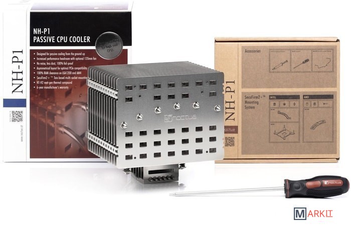| Комплектация | Радиатор NH-P1Система крепления SecuFirm2+НТ-Н2 термопастаСалфетка для очистки NA-CW1Отвертка NM-SD1Зажимы для дополнительного 120-мм вентилятораМеталлический значок Noctua |