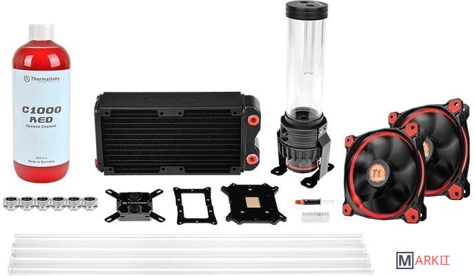Жидкостное охлаждение с радиаторным блоком для внутреннего крепления или наружнего крепления в полном комплекте + 2 корпусных вентилятора и жидкость для СВО красного цветаСостав набора:Pacific W1 CPU Water Block x 1Pacific PR22-D5 Pump/Reservoir Combo x1 Pacific RL240 Radiator x1 Pacific OD Compressor x6Riing 12 LED Radiator Fan x2 C1000 Red Opaque Coolant 1000ml V-Tubler PETG Tube 16mm(5/8") OD 500mm 4Pack x1Intel and AMD Universal Backplated & Mounting Kit24pin ATX Bridge Tool x1Thermaltake Thermal Grease x1