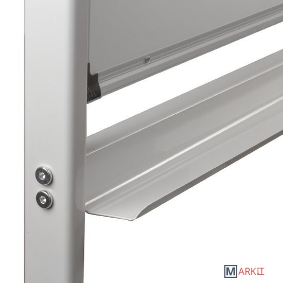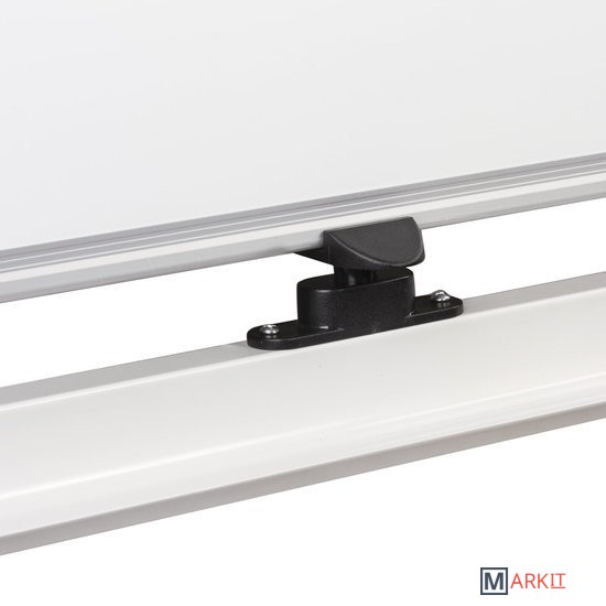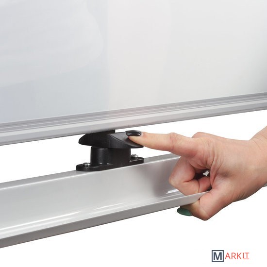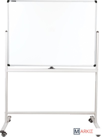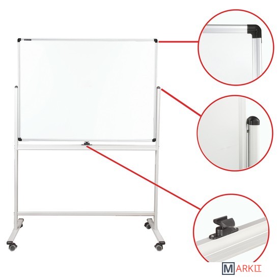 Лаковое покрытие предназначено для письма специальными маркерами для белой доски, а металлическая поверхность позволяет размещать информацию при помощи магнитов. Вращается в горизонтальной плоскости на 360 градусов. Легко перемещается на стенде. Алюминиевая рама придает доске необходимую прочность. Элементы крепления входят в комплект. Размер — 90х120 см.