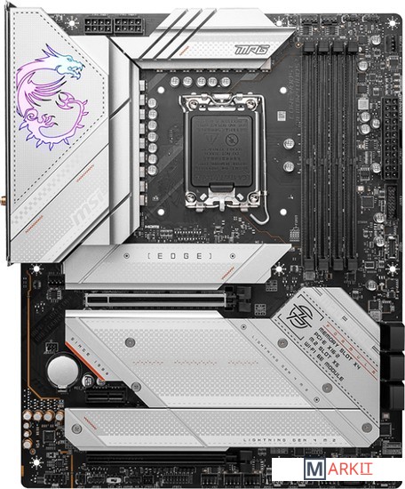 Материнская плата MPG Z790 EDGE WIFI DDR4 представлена в серебристо-белом оформлении, дополненном красочной подсветкой. Стильный дизайн сочетается в ней с отличной производительностью.Серия MPG привлекает пользователей сочетанием высокой производительности и уникального стиля. Все больше геймеров хотят подчеркнуть свою индивидуальность, Следуя современным тенденциям, поэтому серия MPG фокусируется не только на мощности выходящих в ее рамках устройств, но и на их внешнем виде.Увеличенный радиаторБлагодаря увеличенному радиатору увеличивается общая площадь теплорассеивания, что способствует эффективному охлаждению под высокими нагрузками.Тепловая трубка с прямым контактомСоединяет два радиатора системы питания, чтобы увеличить общую площадь теплорассеяния.Система охлаждения M.2 Shield FrozrСистема охлаждения для твердотельных накопителей в разъемах M.2 предотвращает падение производительности, которое может случиться из-за перегрева.Термопрокладки 7 Вт/(м·K)Для передачи тепла от силовых элементов к радиатору используются высокоэффективные термопрокладки 7 Вт/(м·K).Улучшенное охлаждение M.2Двухсторонние радиаторы M.2 Shield Frozr и их увеличенный размер обеспечивают безопасность PCIe 5.0 M.2 SSD, предотвращая дросселирование.Увеличенный радиатор чипсетаОтсутствие вентилятора помогает избавиться от пыли и шума, а чтобы чипсет не перегревался, его радиатор был значительно увеличен в размере.Специалисты MSI фокусируются не только на экстремальном разгоне, но и на тех аспектах работы компьютера, которые важны при его ежедневной эксплуатации. Так, новые материнские платы серии MSI Z790 обладают улучшенной поддержкой памяти. Для применения оптимальных настроек модулей памяти достаточно активировать XMP-профиль.Поддерживаются процессоры 12-/ 13-го поколения Intel® Core™, Pentium® Gold и Celeron® для сокета LGA 1700Поддерживается память DDR4, до 5333+(OC) МГцВысокоскоростные интерфейсы: слот PCIe 5.0, Lightning Gen 4 x4 M.2, USB 3.2 Gen 2x2Мощная система питания: Duet Rail по схеме 16+1+1 фаз, два 8-конт. процессорных разъема питания, Core Boost, Memory BoostЭффективное охлаждение: большой радиатор системы питания с тепловой трубкой, термопрокладки 7 Вт/(м·K) на элементах питания, дополнительные катушки с термопрокладками и технология M.2 Shield Frozr для производительной работы нон-стоп2.5G Ethernet и Intel Wi-Fi 6E: Uвысокоскоростное и стабильное проводное и беспроводное сетевое подключение для широкого спектра приложенийАудиосистема AUDIO BOOST 5: высококачественное звучание, создающее неповторимую атмосферу в играхВысококачественная конструкция: 6-слойная печатная плата, изготовленная по серверным стандартамПредустановленная панель ввода/вывода: защищает от электромагнитных помех и облегчает установку материнской платы