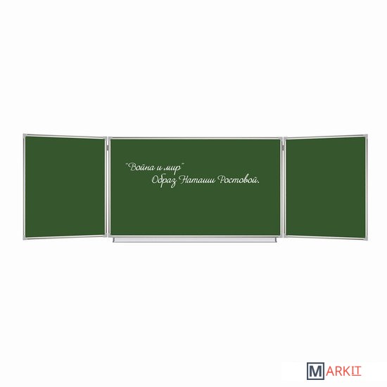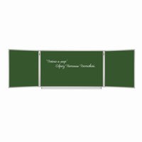 Особенности:— состоит из 3-х элементов: центральная односторонняя секция – 100х150 см, двусторонние боковые секции – 100х75 см каждая;— размеры полки для мела: длина — 135 см, ширина — 4,5 см;— двусторонние боковые секции крепятся к центральной при помощи шарниров;— рабочие поверхности изготовлены из металла с лаковым покрытием;— возможность крепления информации при помощи магнитов;— прочная алюминиевая рамка, укреплённые пластиковые уголки;