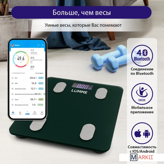 Функциональные особенности расчет доли воды, расчет доли жировой ткани, расчет доли мышечной ткани, расчет доли костной ткани, расчет ИМТ (BMI), индикация температуры помещения, индикация заряда батареи