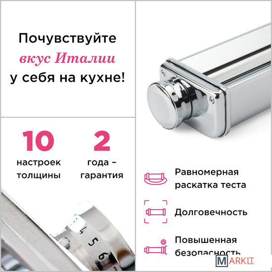 Насадка для кухонного комбайна Kenwood KAX99.A0ME станет незаменимым помощником в раскатывании теста для пасты. ИТАЛЬЯНСКИЕ БЛЮДА НА ДОМАШНЕЙ КУХНЕ Настоящую пасту можно готовить дома с помощью насадки для кухонного комбайна Kenwood KAX99.A0ME. Тесто после раскатки на насадке от Kenwood получается ровным, гладким и идеальной толщины для дальнейшего приготовления пасты. Получите более широкие листы с насадкой 22см. Благодаря 10 настраиваемым режимам Вы можете получить тесто необходимой ширины для приготовления лазаньи, равиоли и тортеллини. Широкая насадка идеально подходит для приготовления лепешек и питты. Насадка удобна в использовании. Ее можно с легостью очистить после использования, к ней не прилипает тесто, не деформируется и не поддается коррозии, а так же в комплекте идет щеточка, которая сделает уход за насадкой еще более простым. Важно, насадку нелья мыть, только протирать влажной салфеткой.