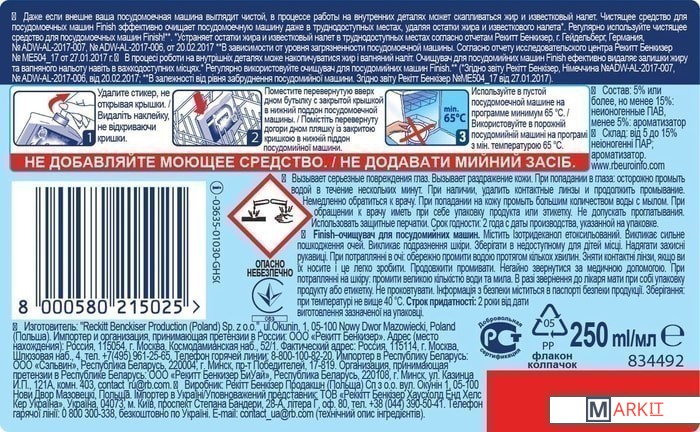 Очиститель для посудомоечных машин Finish удаляет жир и известковый налет в посудомоечной машине, и ваша посуда буквально сияет чистотой. Жир и известковый налет скапливаются на поверхности важнейших внутренних деталей посудомоечной машины, что оказывает влияние на качество мытья посуды.Очиститель Finish удаляет жир и известковый налет: благодаря ему ваша посудомоечная машина всегда идеально чистая и благоухает свежестью!