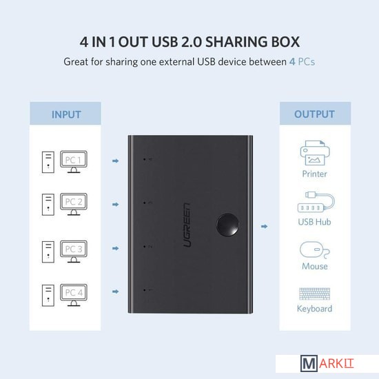 Markit » Кабели, адаптеры, разветвители » Переключатель Ugreen Sharing Switch 30346 USB Type-A - 4 x USB Type-B (1.5 м, черный)