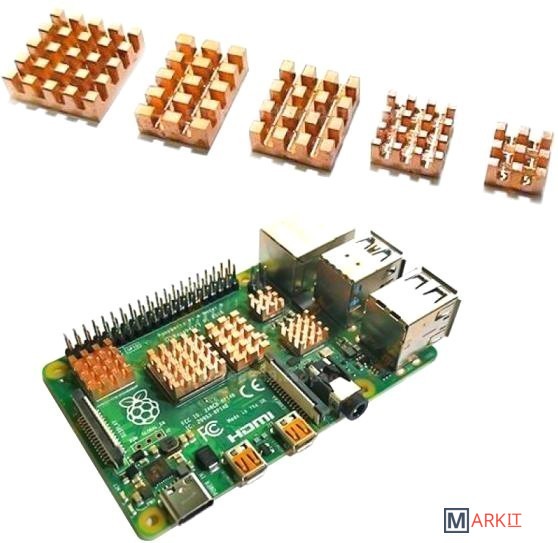 Комплект из пяти медных радиаторов для охлаждения микросхем одноплатного микрокомпьютера.15x10x4мм, 14x14x4мм, 13x11x4мм, 9x9x4мм и 7x7x4ммСовместимость Raspberry PI 4 model B