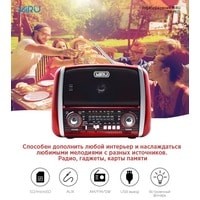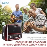 Портативный радиоприёмник с фонариком - радио колонка MP3 c работой от сети аккумулятора и батареек. Радиоприемник MIRU SR-1025 выполнен в красно-чёрном корпусе с ретро дизайном и представляет собой простое устройство для воспроизведения потокового радио вещания. Модель предусматривает всего один динамик, но этого вполне достаточно, чтобы вы получили насыщенный звук. Радиоприемник улавливает радио каналы в диапазоне FM, АМ и SW, гарантируя отличную связь благодаря встроенной телескопической антенне, которая способствует улучшению сигнала. MIRU SR-1025 имеет линейный аудио вход и поддержку чтения microSD карт. Благодаря тому что, радиоприёмник работает не только от сети 220 В, но и от аккумулятора или батареек, он является мобильным устройством. Вы сможете взять его на пикник и наслаждаться трансляцией любимой радио передачи в компании с веселыми ведущими. Для управления устройства предусмотрены механические переключатели.