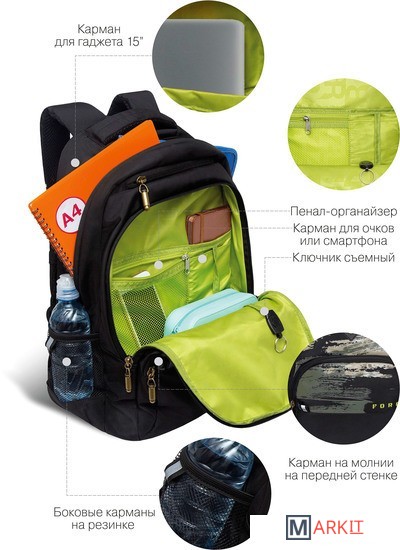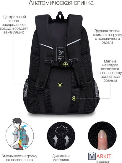 Эту серию рюкзаков GRIZZLY мы разработали для мальчиков старших классов. Они рассчитаны на рост от 150 до 170 см. Рюкзаки яркие и стильные — нравятся подросткам. Рюкзак сделан из плотного полиэстера и хорошо держит форму. Есть светоотражающие элементы. Все швы аккуратно прошиты, а где это нужно, усилены дополнительно. Допустимая нагрузка — 7 кг. Чтобы от такого веса не пострадала осанка, мы сделали анатомическую спинку. Широкие лямки с нагрудной стяжкой со свистком снижают нагрузку на плечи. Несмотря на то, что подросткам приходится носить с собой много вещей, в школьный рюкзак они помещаются. Здесь есть два больших основных отделения для книг, тетрадей и папок А4. Много внутренних и внешних карманов, пенал, брелок для ключей, отделение быстрого доступа для документов и кошелька. Материал рюкзака с водо- и грязеотталкивающей пропиткой. Если рюкзак все же чем-то испачкался, мы рекомендуем ручную стирку в холодной воде.
