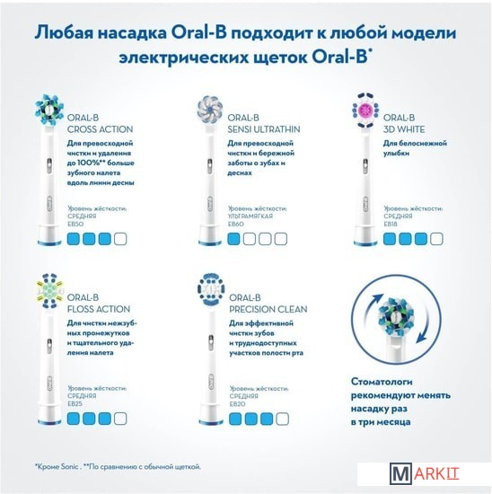 Совместимые модели Подходит ко всем электрическим зубным щеткам Oral-B, кроме звуковых электрических зубных щеток Oral-B Sonic/Pulsonic. / Подходит ко всем электрическим зубным щеткам Oral-B, кроме звуковых электрических зубных щеток Oral-B Sonic/Pulsonic, а также Oral-B iO Series.