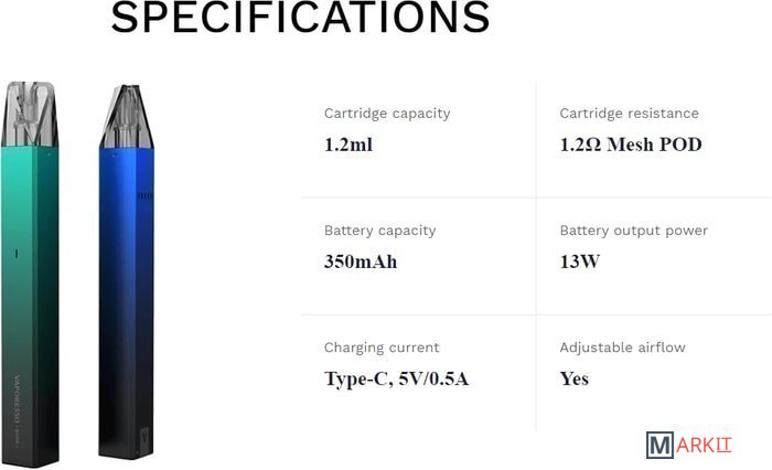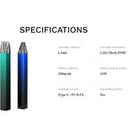 | Комплектация | - 2 картриджа 1.2 мл- кабель для зарядки- документация |