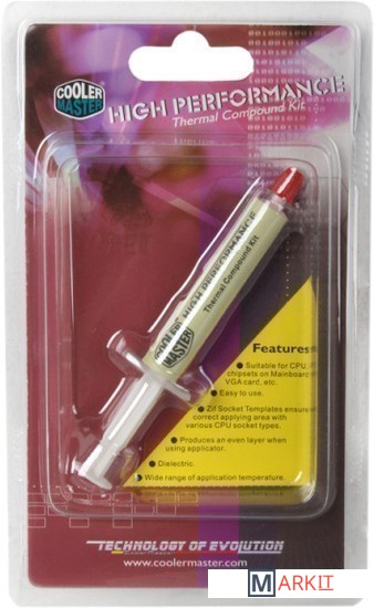 Cooler Master HTK-002-U1-GP - высокоэффективная теплопроводная паста для наиболее популярных процессоров. Низкое термосопротивление и оптимальная вязкость позволяют уверенно передавать тепло от корпуса процессора к радиатору.