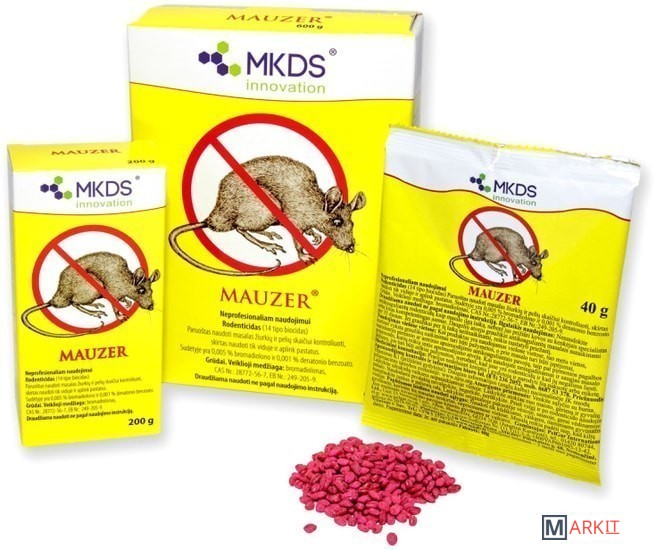 Mauzer (Маузер) представляет собой готовую к использованию ядовитую приманку для борьбы с грызунами - мышами и крысами. Средство предназначено для непрофессионального использования внутри и вокруг зданий.Использование:Приманку следует распределить в местах наибольшей активности грызунов. Не рекомендуется класть зерно в одном месте - для наилучшего эффекта необходимо охватить всю территорию распространения грызунов. Приманка обладает привлекательным для крыс и мышей ароматом. Грызуны, съевшие приманку, погибают через 4-6 дней от внутреннего кровотечения.Ежедневно следует осматривать контролируемый участок и собирать павших грызунов для утилизации. В случае, если приманка съедена, необходимо увеличить ее количество и расширить площадь применения.Для безопасности домашних животных и птицы ядовитую приманку нужно размещать в недоступных для них местах. Приманка должна быть защищена от влаги. После 35 суток использования, в большинстве случаев, грызуны будут уничтожены. Если этого не произошло, следует обратиться к специалистам для выяснения причин и принятия мер.