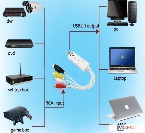Устройство видеозахвата предназначено для подключения техники с видео/аудио входами RCA, S-Video к компьютеру. В основном используется для оцифровки видео кассет и подключения видеомагнитофонов, камер наблюдения и других устройств к компьютеру или ноутбуку, позволяет захватывать и оцифровывать видео и аудио сигнал напрямую через USB-порт без применения видеокарты. Версия PLUS оснащена дополнительным адаптером AV/S-видео и кабелем RCA 1,5м.Характеристики:– Поддержка форматов NTSC, PAL, Video format.– Видеовход: один композитный RCA, один S-Video.– Аудиовход: стереозвук 2 RCA.– Поддерживает запись на диски: DVD+/-R/RW, DVD+/-VR и DVD-video.– Поддержка высококачественного видео разрешения NTSC: 720×480 30кд/с; PAL: 720×576 25кд/с.– Системные требования: Свободный порт USB 2.0; 600MB свободного места на диске для установки ПО; 4GB и более свободного места на диске для захвата видео и редактирования; Память: 256MB RAM; Дисплей: не менее 1024*768; Звуковая карта: совместима с Windows-Sound card.– ОС: Win 2000, Win 7/8/10, Win XP, Win Vista, MAC IOS.– Не нуждается во внешнем питании.