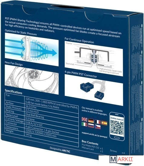 Вентилятор с поддержкой технологии PST от Arctic - возможность подключения цепочкой до 5 вентиляторов от одного 4pin разъема. Процессорный вентилятор должен быть последним в цепочке.