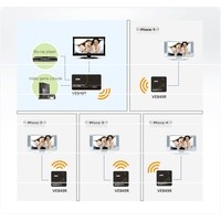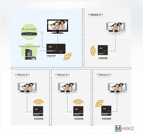 VE849T-AT-G – беспроводной передатчик позволяет расположить дисплеи с интерфейсом HDMI на расстоянии до 30м от источников HDMI-сигнала при использовании совместно с приемниками VE849R. А также выполнить простое подключение двух источников HDMI сигнала, например, телевизора, и без проводов подсоединить до четырех приемников с подключенными к ним другими телевизорами. ИК-пульт дистанционного управления позволяет удаленно переключаться между источниками HDMI-сигнала непосредственно со стороны приемника и позволяет одновременно просматривать один подключенный локально и четыре подключенных по беспроводному соединению телевизора.