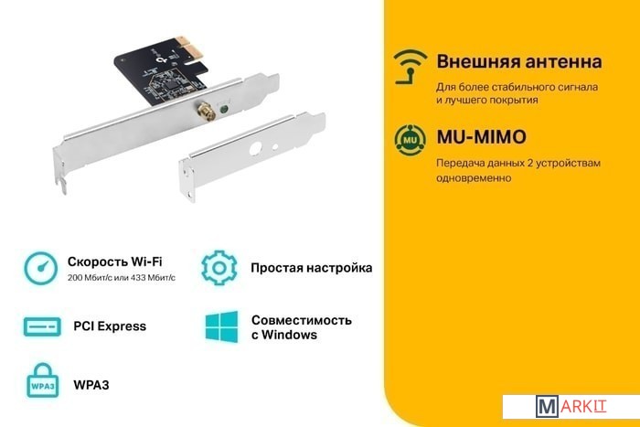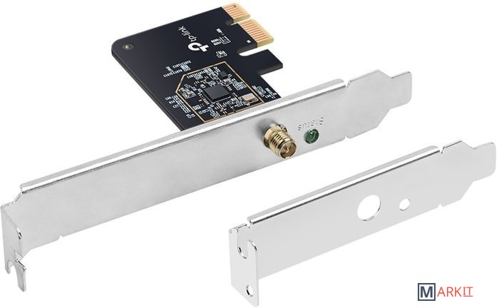 Archer T2E позволяет создать на компьютере двухдиапазонный Wi‑Fi. Также его можно использовать в качестве хот‑спота, чтобы делиться интернетом с другими Wi‑Fi устройствами. Используйте 2,4 ГГц для просмотра веб‑страниц, работы с почтой и соцсетей, а 5 ГГц — для онлайн‑игр и стримов.MU-MIMO позволяет создать несколько одновременных потоков данных, что улучшает пропускную способность и эффективность при использовании MU‑MIMO роутера.WPA3 — это новейший протокол, повышающий безопасность персональных Wi‑Fi сетей. Более надёжное шифрование Wi‑Fi пароля и защита от брутфорс‑атак обеспечат полноценную защиту домашнего Wi‑Fi.Возможность установки антенны в необходимое положение и её замены любой другой совместимой направленной антенной для расширения покрытия.Для совместимости с любым типом компьютерного корпуса в комплекте идёт стандартная и низкопрофильная планки.