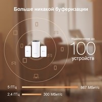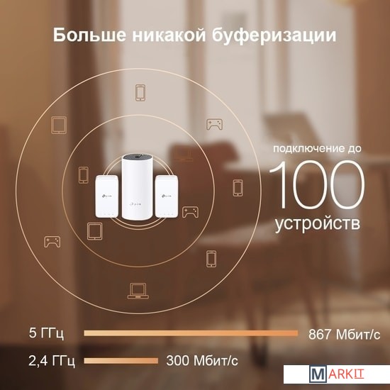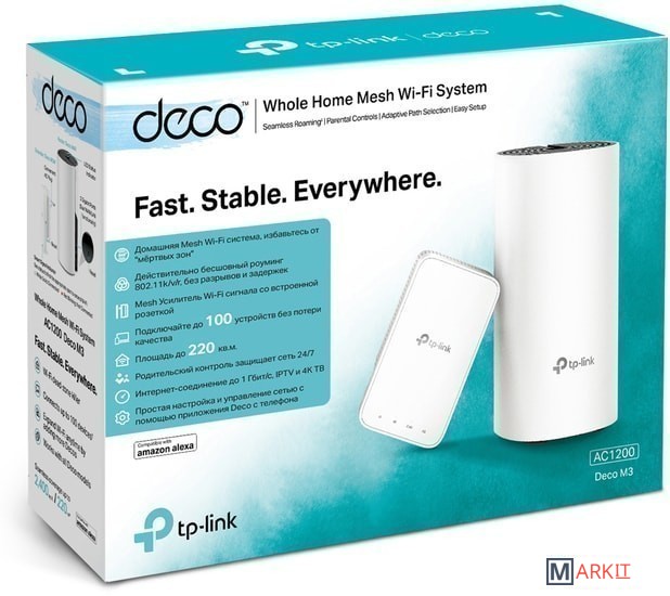 Комплект состоит из Deco M4R и Deco M3W.Deco использует систему модулей для бесшовного Wi-Fi — раз и навсегда устраните зоны со слабым сигналом. Deco M3 с двумя устройствами (1 устройство Deco M4R и 1 усилитель Deco M3W) обеспечивает покрытие Wi-Fi на расстоянии до 223 м². Увеличьте покрытие Mesh Wi-Fi, просто добавив больше модулей Deco M3W.Благодаря технологии Deco Mesh модули создают единую сеть Wi-Fi с одним именем. При перемещении по дому устройства будут автоматически переключаться между модулями Deco для достижения максимально возможной скорости. Deco M3 обеспечивает быстрое и стабильное подключение со скоростью до 1167 Мбит/с и работает со всеми основными интернет‑провайдерами. Deco справится с передачей данных даже в самых загруженных сетях, обеспечивая непрерывное соединение не более чем для 100 устройств.Родительский контроль позволит ограничить время в сети и заблокировать нежелательный контент в соответствии с уникальными профилями, созданными для каждого члена семьи. Благодаря пошаговой инструкции в приложении Deco настройка не отнимет много времени.